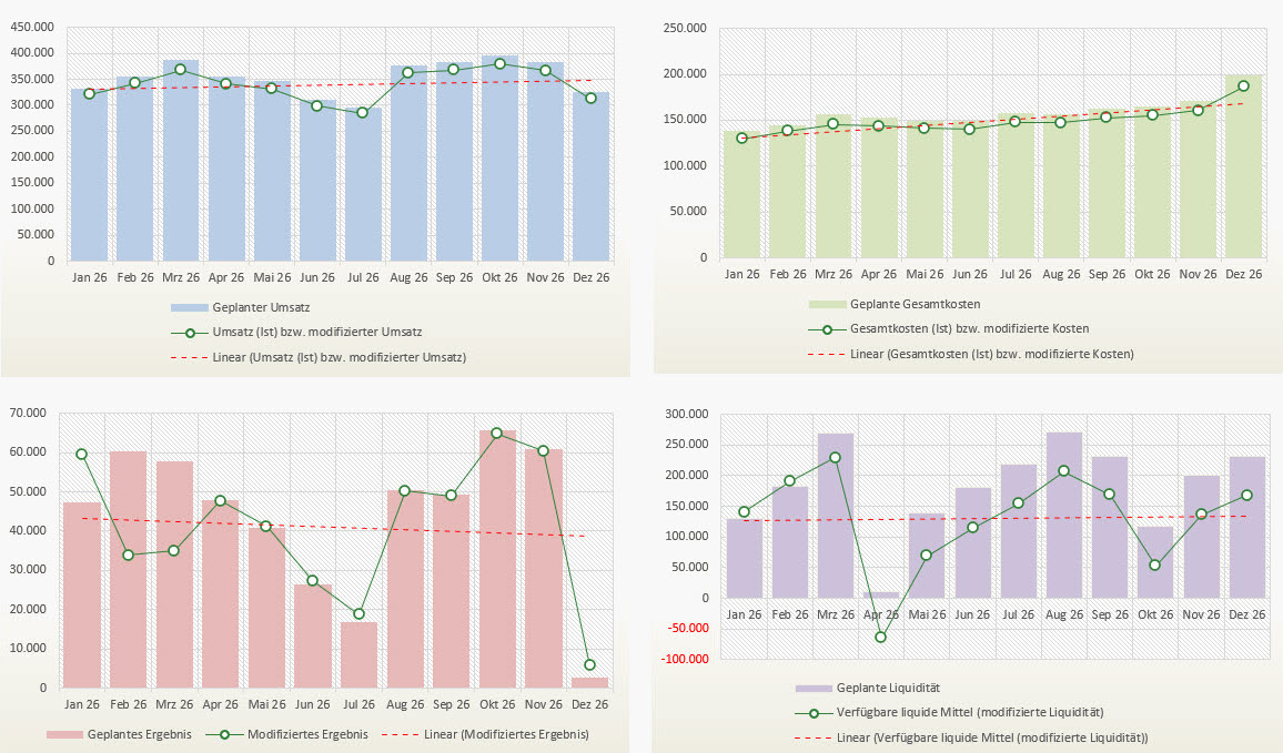 Im Rahmen des Planungssystems ist deshalb ein Frühwarnsystem integriert, das die laufende Kontrolle der Liquidität sicherstellt. Dieses System ermöglicht es, die geplanten Werte regelmäßig zu überprüfen und bei Abweichungen umgehend Anpassungen vorzunehmen, um die Planung stets an die aktuellen Gegebenheiten anzupassen.